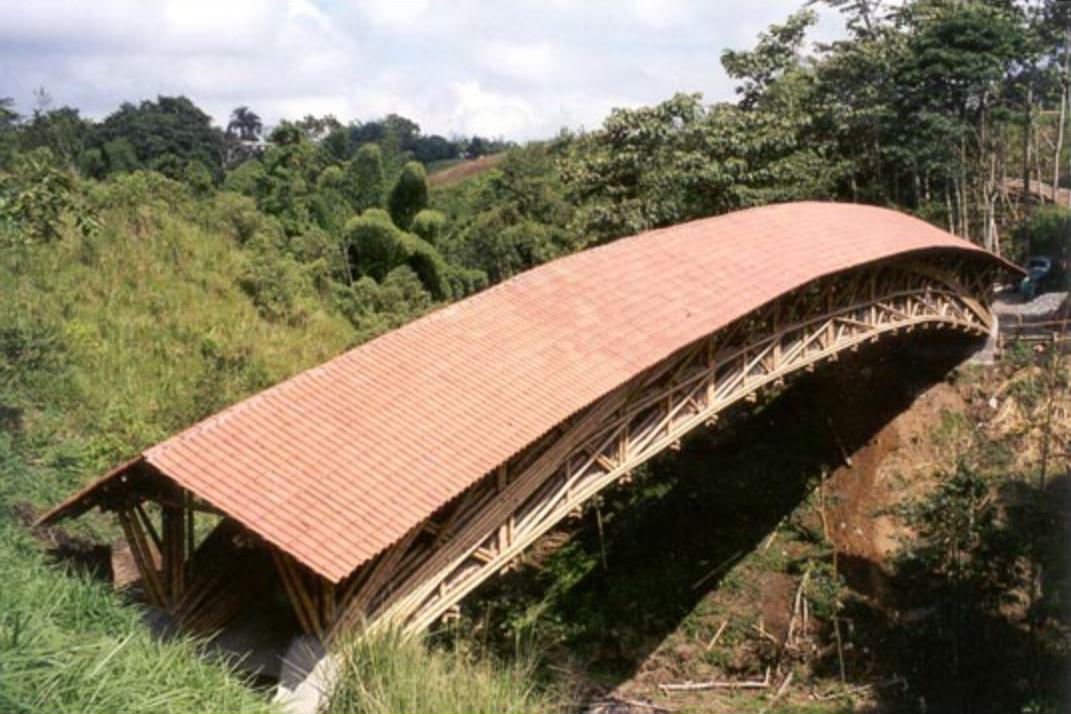 Auf der Wanderschaft hatte ich die historischen Holzbrücken bewundert, und heute baue ich in deren Tradition hier bis 40 Meter lange, ziegelgedeckte Bambusbrücken zu durchaus konkurrenzfähigen Preisen. Angefangen hat diese Bambusbauerei nach einem Erdbeben in einem Andental. Eine 20 Meter hohe Schlammlawine, getriggert durch das Beben, hatte Häuser, Schulen und Straßen weggeschwemmt, 2.000 Personen sollen damals umgekommen sein, 120.000 waren obdachlos geworden. Moderne Baustoffe mussten eingeflogen werden, aber mit den lokalen natürlichen Rohstoffen wurde schon mal notdürftig wiederaufgebaut. Das hat dem noch vorhandenen natürlichen Waldbestand nicht gutgetan, und wir entwickelten dann mit dem nachhaltig nutzbaren Riesenbambus ein neues Bausystem. Mehrere Brücken, Schulen und Gemeindezentren habe ich in der Folgezeit gebaut.