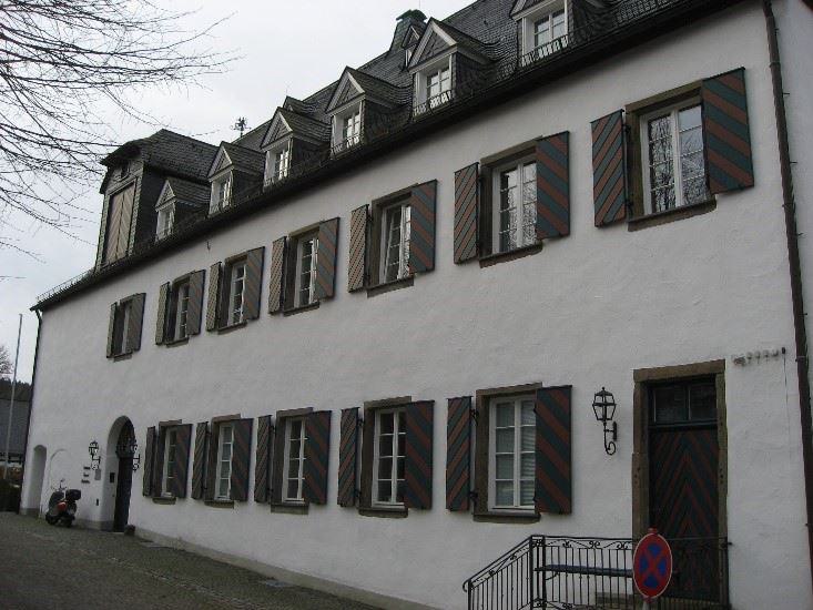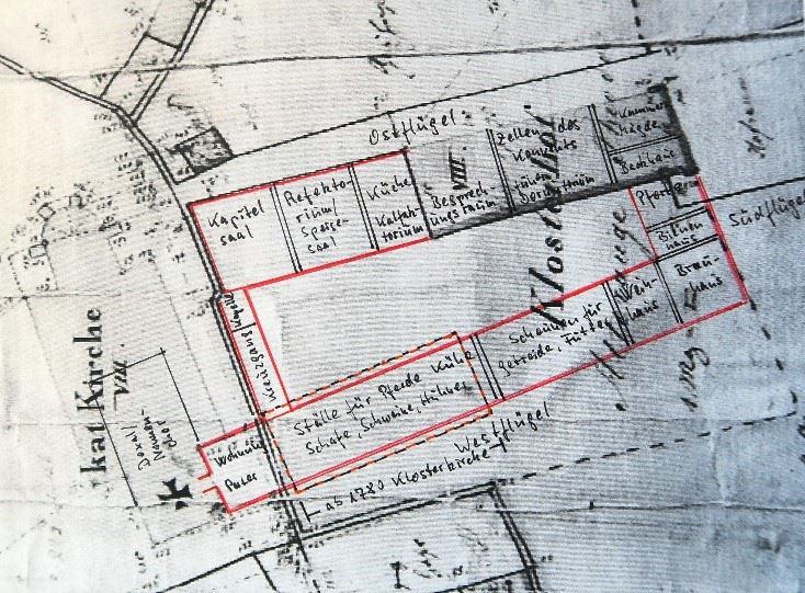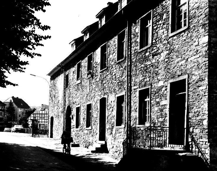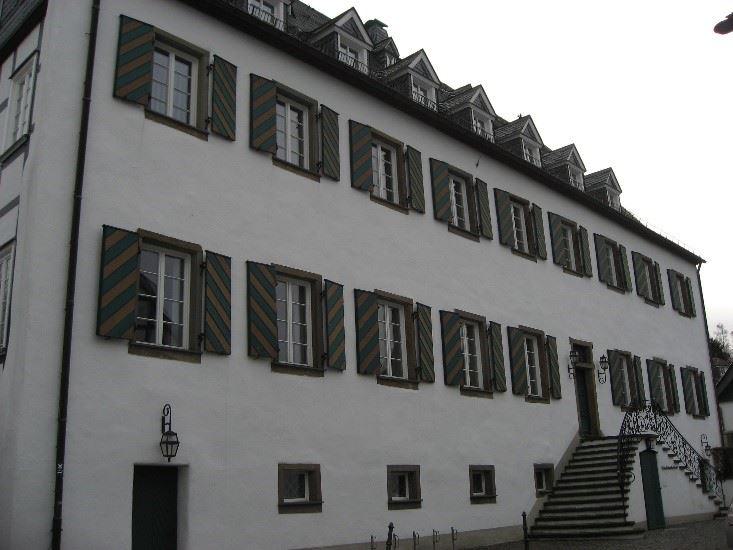 Dies ist der Rest des ehemaligen Klosters, das im 13. Jahrhundert gegründet wurde. Es lag außerhalb der in den 1470er Jahren errichteten Stadtmauern. Seit ca. 1770 gehörte zu dem Kloster eine Kirche. 1802 wurde unsere Region nach jahrhunderte langer Zugehörigkeit zu Kurköln, dem Großherzogtum Hessen-Darmstadt zugeschlagen, das Kloster aufgelöst und bis auf den hier stehenden Trakt abgerissen. Die abgerissene Klosteranlage ist rot eingezeichnet.
