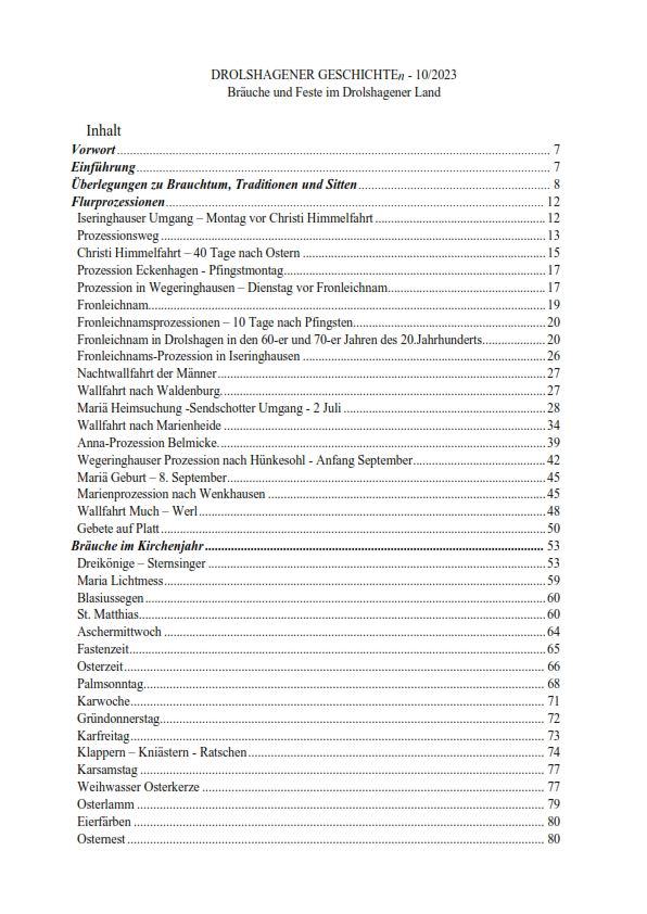Das diesjährige Jahresheft enthält 13 Beiträge aus der Geschichtswerkstatt. Dabei sticht besonders der umfangreiche Bericht von Sascha Koch aus Hützemert hervor. Auf 38 Seiten beschreibt er detailliert alle öffentlichen Verkehrsmittel im Drolshagener Land, von den Anfängen vor über 300 Jahren mit regelmäßig verkehrenden Postkutschen bis hin zu autonom fahrenden Bussen. Die Problematik der Mobilität „auf dem flachen Land“ ist ja ein aktuell hochpolitisches Thema, welches Sascha Koch, kenntnisreich wie kaum jemand im hiesigen Raum, in seinem Beitrag nicht auslässt.