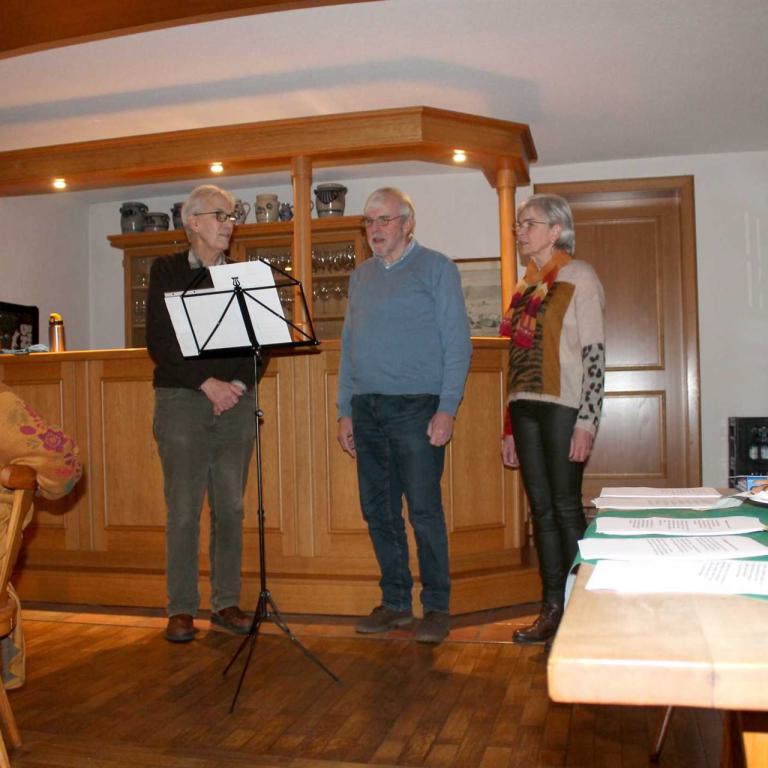 Die drei Geschwister Franz-Günther und Heinz Stachelscheid, zusammen mit ihrer Schwester Christa Schwung trugen sie diese Lieder dreistimmig im Stil und den Harmonien des Alpenländischen Adventsgesangs schon fast professionell vor. Mutig hatten sie sich auch an den schwierigen Satz des „Weigenleids“ der Christine Koch herangewagt. Der Beifall in der voll besetzten Gaststube des Heimathauses bestätigte, dass das Wagnis zu einem Erfolg geworden war. Fast wären dabei die vielen launigen oder besinnlichen Texte, die von Mitgliedern der Plattdeutschen Runde vorgetragen wurden, untergegangen.