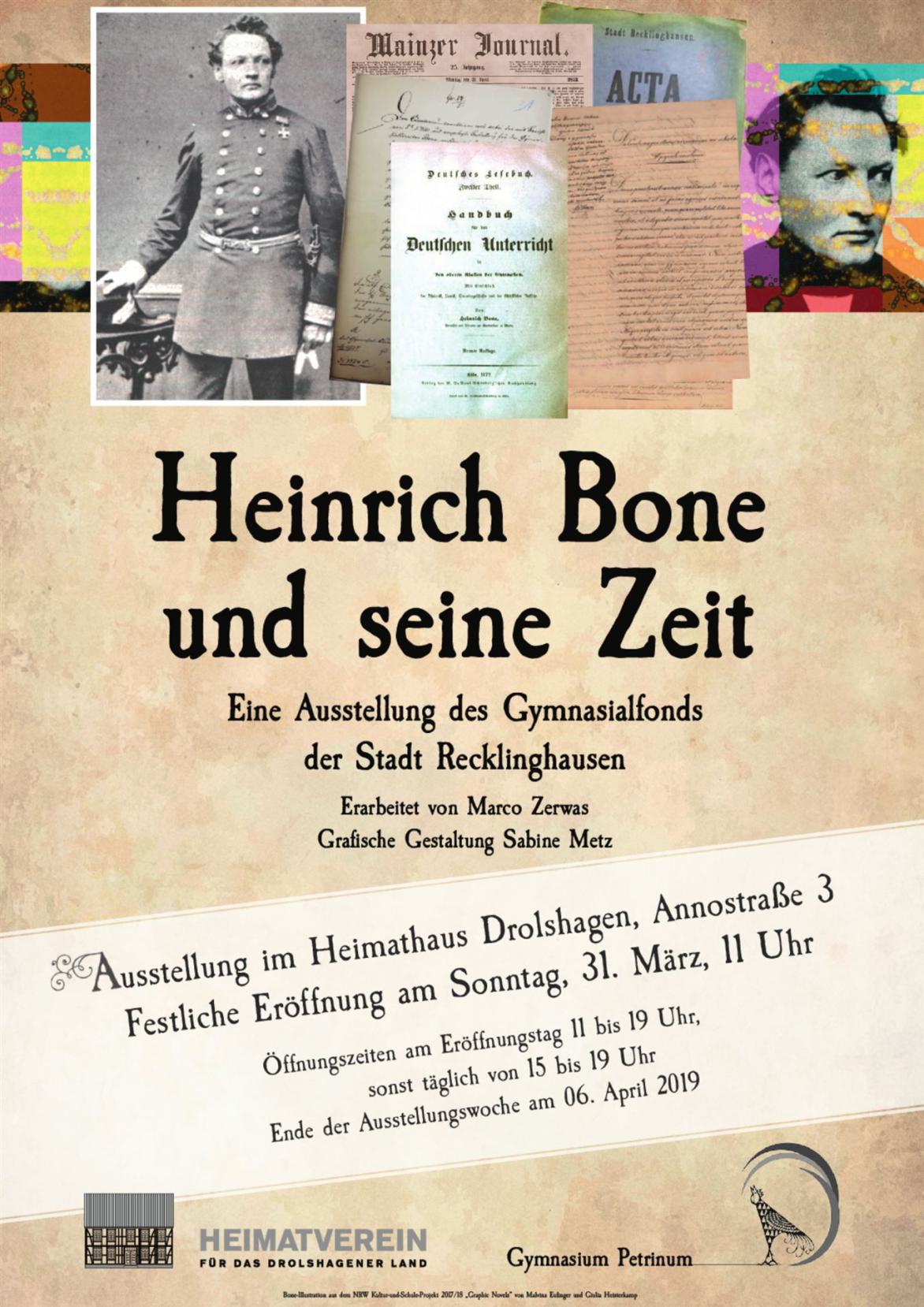 Diesem großen Sohn der Stadt widmet der Heimatverein eine Ausstellung im Heimathaus mit künstlerisch gestalteten Plakaten, bemerkenswerten Schülerwerken aus dem Kunstunterricht, einigen seiner Originalbücher und anderes aus seinem Leben. Dabei konnte der Heimatverein auf eine Ausstellungskonzeption des Recklinghauser Gymnasiums Petrinum, an dem Heinrich Bone sein Abitur gemacht hatte und das er mit 43 Jahren als Direktor geleitet hat, zurückgreifen. Anlässlich des 125. Todestages von Heinrich Bone hatte das Petrinum ein Projekt zu ihm und seiner Zeit in Unterricht und intensiver historischer Forschung durchgeführt. Bei der Eröffnung in Recklinghausen vereinbarte der Heimatverein gleich an Ort und Stelle eine Fortsetzung der Präsentation am Geburtsort des Pädagogen und obendrein in seinem Elternhaus, heute Heimathaus.