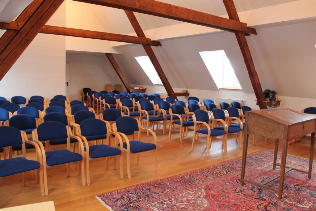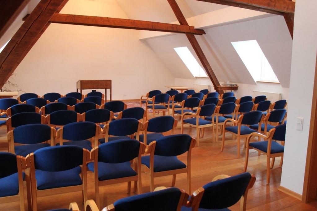 Im zweiten Obergeschoss befindet sich der Vortragssaal. Ein Aufzug ist über den Anbau vorhanden!
