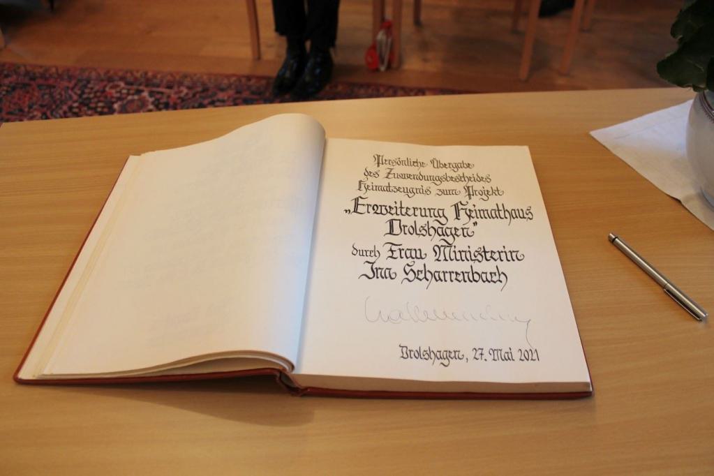 In seiner Glückwunschrede betonte der Landtagsabgeordnete Jochen Ritter, dass der Landtag ohne spezielle Vorgaben grundsätzlich das unterstütze, was jeweils in den Regionen des Landes unter „Heimat“ verstanden wird. Mit seinem anspruchsvollen Konzept führe der Drolshagener Heimatverein seine erfolgreiche Arbeit auf hohem Niveau fort. Der Drolshagener Bürgermeister Uli Berghof bedanke sich beim „Heimatverein für das Drolshagener Land“ für dessen mutige Initiative und die damit in Aussicht stehenden erweiterten Nutzungsmöglichkeiten des Heimathauses für die gesamte Bürgerschaft. Der Ministerin Ina Scharrenbach dankte er für ihr persönliches Erscheinen in Drolshagen und ihre Entscheidung, das Bauvorhaben finanziell aus den bereitstehenden Haushaltsmitteln des Landes zu fördern. Diese Zuwendung sei die höchste Förderung an private Einrichtungen, die je nach Drolshagen geflossen sei. Er freue sich, auch in Zukunft die Ministerin in Drolshagen begrüßen zu dürfen – „gerne auch mit weiteren Bewilligungsbescheiden“ fügte er humorvoll hinzu. Offizieller Schluss der Veranstaltung war die Eintragung der Heimatministerin ins Goldene Buch der Stadt.