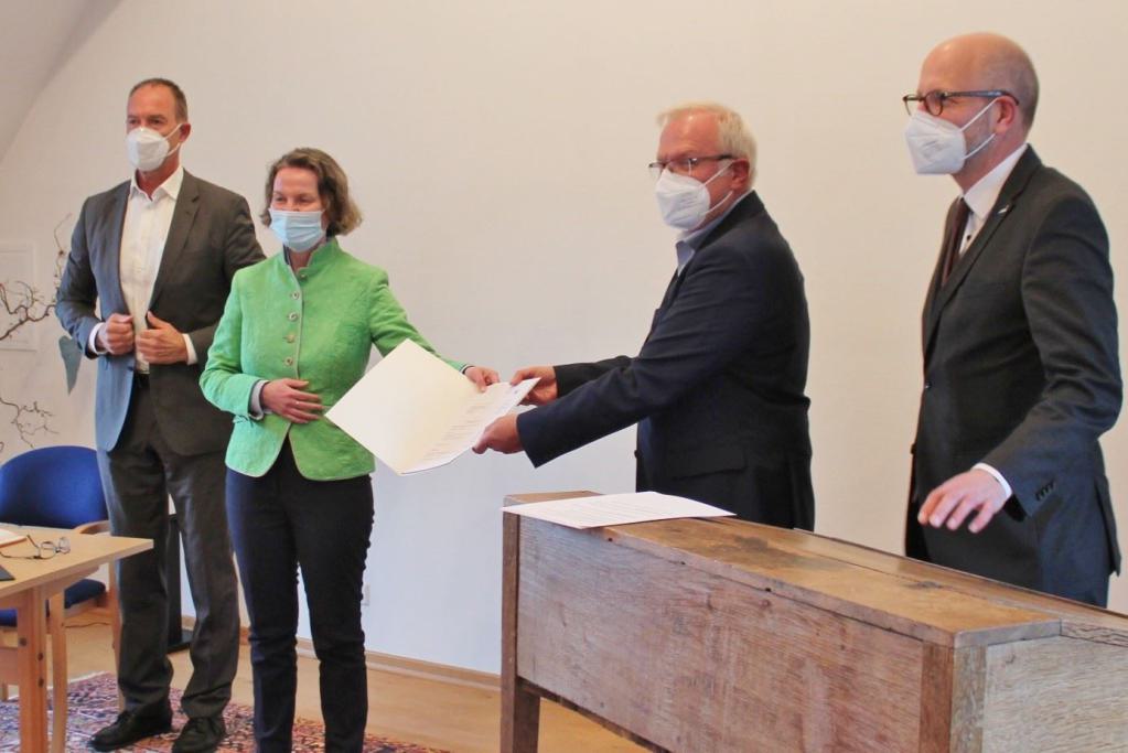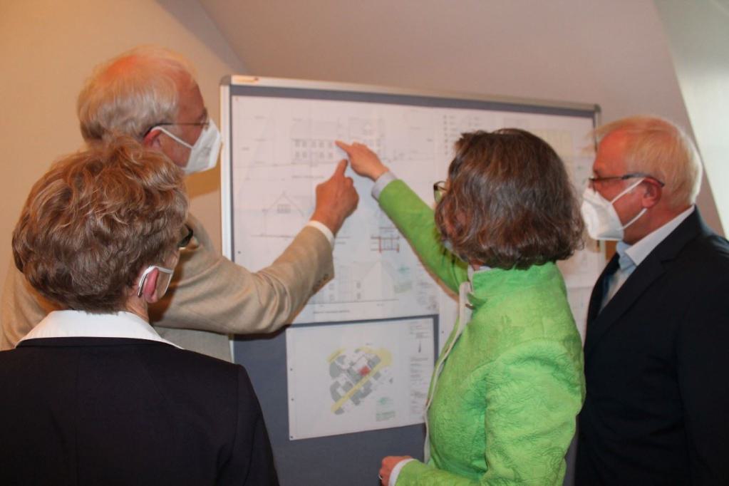 Ihre Rundreise durch den Kreis Olpe am Donnerstag, den 27.05.2021 beendete Ina Scharrenbach, Ministerin für Heimat, Kommunales, Bauen und Gleichstellung des Landes NRW im Heimathaus in Drolshagen. Ministerin Ina Scharrenbach„Ihr Konzept hat uns überzeugt“, so die Rückmeldung der Bezirksregierung auf den Förderantrag des Drolshagener Heimatvereins zum Anbau des bestehenden Heimathauses. Ina Scharrenbach übergab den entsprechenden Förderbescheid über 889.076 Euro an den Vorstand des Vereins (Dr. Stephan Schlösser, Petra Lütticke, Georg Melcher und Winfried Behme) im Beisein des Landrates Theo Melcher, des Bürgermeisters Ulrich Berghof, des Landtagsabgeordneten für den Kreis Olpe Jochen Ritter, der Architektin Eva Maria Nebeling und Mitgliedern des Heimatvereins. Neunzig Prozent der Baukosten sind somit gesichert, der Rest wird aus Eigenmitteln der Vereinskasse bezahlt.