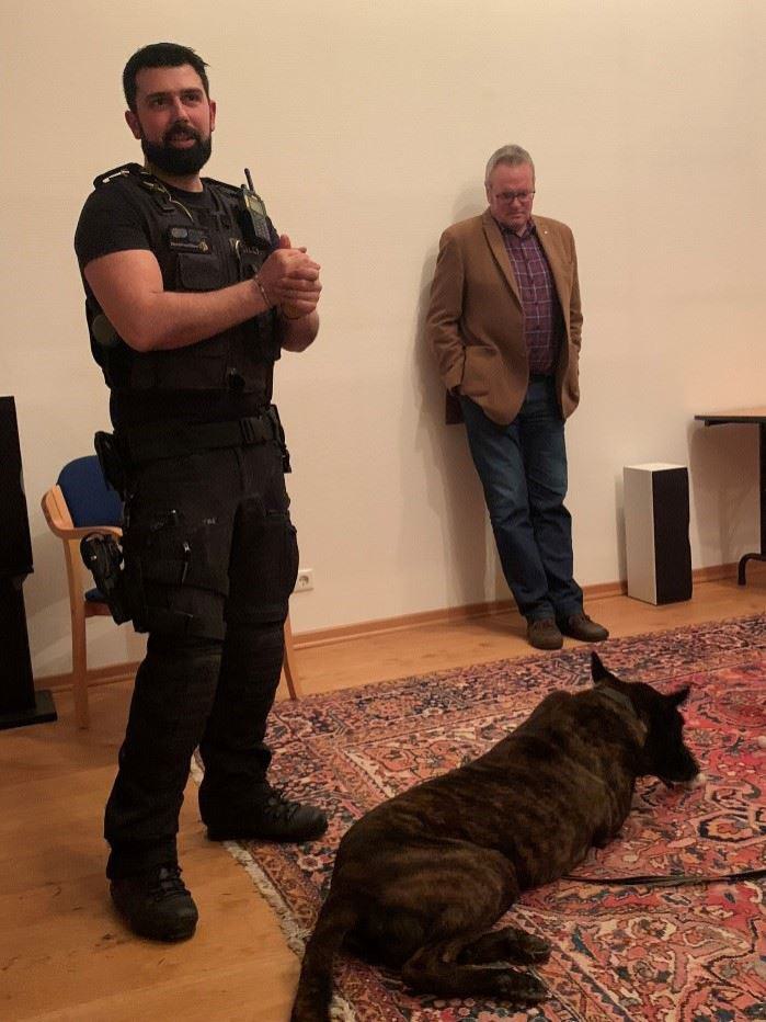 Drolshagen. Vor versammeltem Publikum erschnüffelte er schnell und sicher die im Vortragssaal versteckten Proben. Im Rahmen der Veranstaltungsreihe „Drolshagener mit besonderen Berufen“ stellte der Heimatverein für das Drolshagener Land mit Ioannis Minas Shinas einen Polizeihundeführer vor. Shinas berichtete ausführlich und lebhaft über die Erziehung, Haltung und „fachliche“ Ausbildung der Diensthunde. Spezielle Trainings machen sie zu Experten in der Verfolgung von Straftätern, als Schutzhunde oder als Spürhunde für Drogen, Datenträger, Bargeld oder Sprengstoffe. Shinas, der auch Ausbilder für Polizeihundeführer in Südwestfalen ist, verband seine Liebe zu Hunden mit seinem Beruf als Polizist. Odin gehört zwar dem Land NRW, ist aber in seiner „dienstfreien“ Zeit ein ganz normaler Hund im Haushalt seines „Herrchens“ - und darf auch im Alter nach seiner „Pensionierung“ bei ihm bleiben.