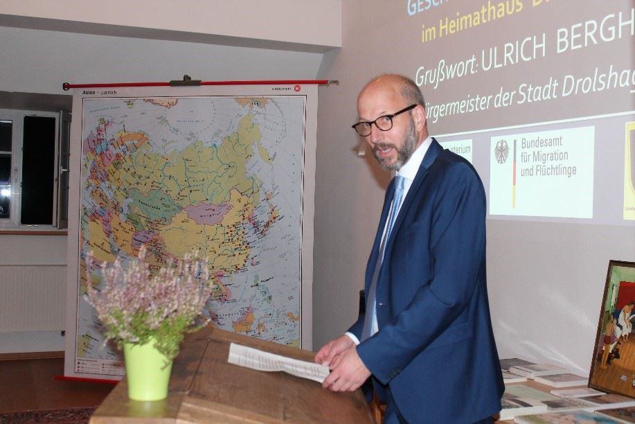 Den Gedanken aus der Ausstellung, dass die eingewanderten Russlanddeutschen nach Jahrzehnten der Unterdrückung endlich eine wirkliche Heimat finden können, hatte der Bürgermeister der Rosestadt Uli Berghof in seiner Begrüßung aufgegriffen und verdeutlicht, dass auch aktuell Menschen vor Unterdrückung und Verfolgung fliehen und eine neue Heimat suchen. Wer, wenn nicht diejenigen, die die eine Heimat verlassen haben, um eine neue zu finden, könnten besser verstehen, was viele der Geflüchteten gegenwärtig erfahren. Auch die Russlanddeutschen haben Skepsis und Ablehnung erlebt, aber auch, wie es in der Ausstellung beschrieben wurde, die Erwartung gehabt, mit offenen Armen aufgenommen zu werden, zumal sie sich auch als einen Gewinn für das Land verstehen. Dies gelte auch für die neue Situation, in der sich das Land und die Stadt befinden.
