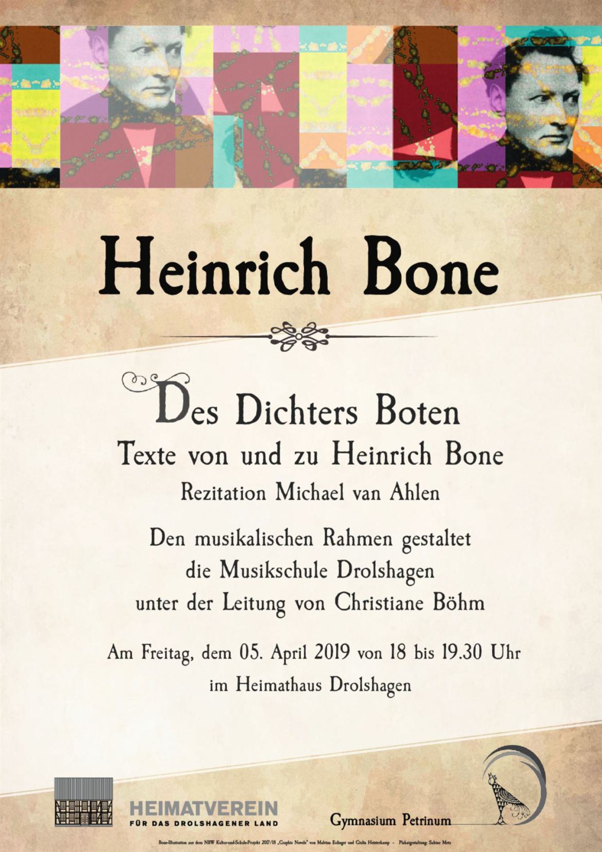 Um der Vielfalt seines Wirkens gerecht zu werden, wird die Ausstellung am Sonntag, den 31. März 2019 um 11.00 Uhr im Heimathaus unter Mitwirkung des heutigen Recklinghauser Schulleiters Michael Rembiak, des Germanisten Marco Zerwas, der in Leben und Werk von Heinrich Bone einführt, sowie der Kunstpädagogin Sabine Metz, die das Kunstprojekt geleitet und die Plakate gestaltet hat, eröffnet. Eine künstlerische Hommage an Heinrich Bone wird am 5. April von 18.00 bis 19.30 Uhr unter dem Thema „Des Dichters Boten“ mit Rezitationen von Texten von und zu Heinrich Bone sowie musikalischer Begleitung durch die Musikschule Drolshagen stattfinden. Michael van Ahlen, Rezitator aus Recklinghausen, wird über Sprache zur Sprache des Drolshagener Dichters führen. Die Ausstellung ist von nach der Eröffnung bis 19.00 Uhr und von Montag, den 1. April bis Samstag den 6. April täglich von 15.00 bis 19.00 Uhr geöffnet.
