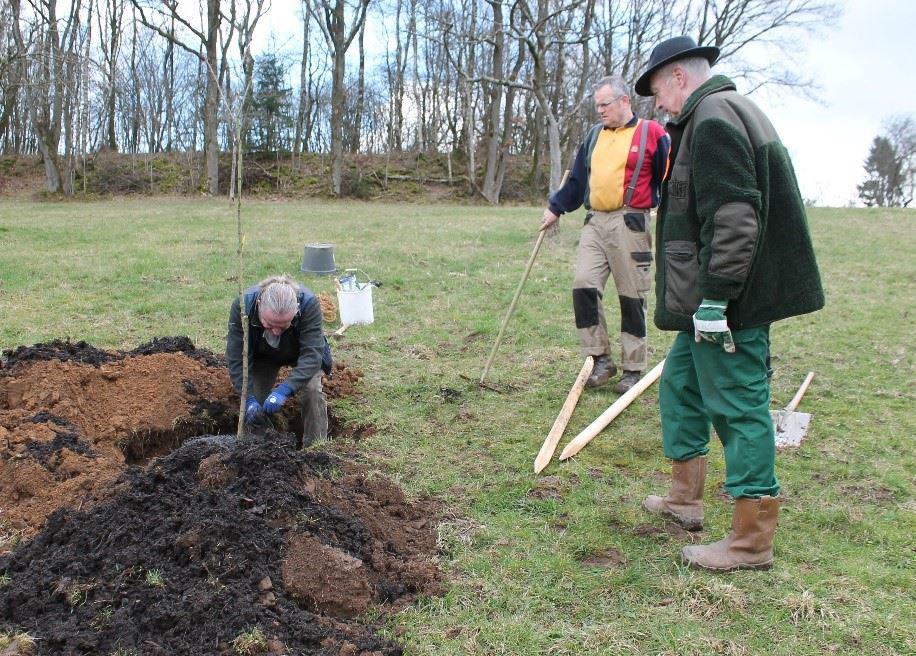 Im vergangenen Jahr mussten auf dem insgesamt 45 Pflanzstellen umfassenden Areal des Heimatvereins etliche Bäume entfernt werden, die krank oder vertrocknet waren. Übrig blieben 12 Bäume aus dem Altbestand, weitere 10 konnten am 14. März 2020 hinzugefügt werden. Dazu wurden 6 Männer aus dem Arbeitskreis von Leo Trumm aktiv, einschließlich eines Baggerfahrers aus Thieringhausen, der die vorbereitenden Arbeiten erheblich erleichterte, indem er den Beteiligten ersparte, die Gruben für die Pflanzung mit der Hand auszuheben. Die Wurzelballen der jungen Pflanzen wurden in einen vorbereiteten Drahtkorb eingeschlagen, um sie gegen Fressfeinde wie Wühlmäuse zu schützen. Da es sich um ein von der unteren Naturschutzbehörde genehmigtes und gefördertes Projekt handelt, wurde auf eine Düngung der Pflanzen verzichtet, wie auch das gesamte Projekt den strengen Vorlagen des Naturschutzes gemäß durchgeführt wird.