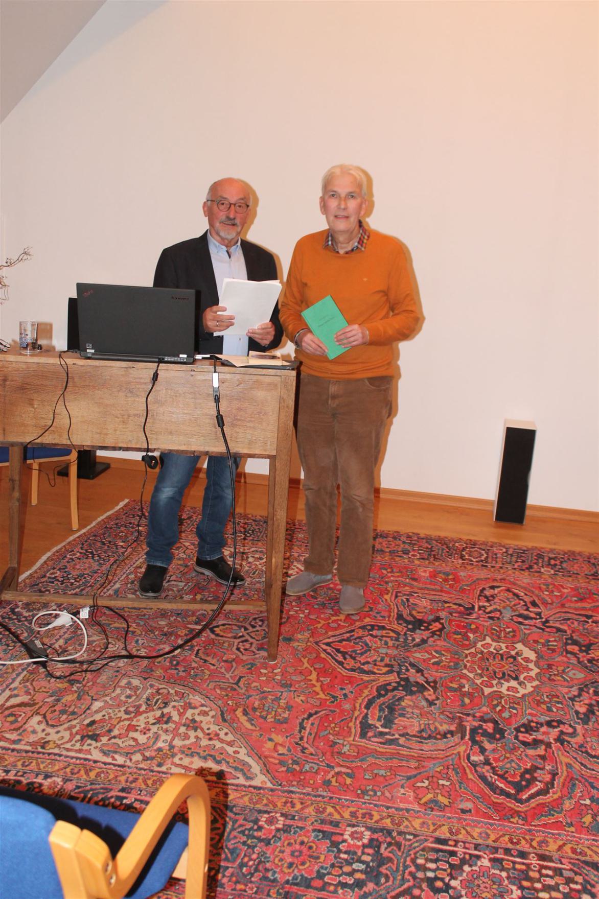 Einen besonderen Schwerpunkt setzte der Referent im zweiten Teil des Vortrags, bei dem er sehr engagiert Widerstand gegenüber der Abwertung des Plattdeutschen vortrug. Er griff exemplarisch auf die veröffentlichten Aussagen eines Drolshageners zurück und widerlegte z. B. dessen Positionen, dass das Plattdeutsche „die bürgerlichen Errungenschaften der hochdeutschen Sprache“ nicht mitgemacht habe. In dem kurzen kritisierten Text waren in 18 Zeilen 10 Worte benutzt, die Fremdworte oder Fachbegriffe und aus anderen Sprachen übernommen waren. Sind das die bürgerlichen Errungenschaften, fragte der Referent. Wenn man auch im Plattdeutschen diese Begriffe übernehmen oder sie in dem typischen Verbalstil des Plattdeutschen übertragen würde, könne man jeden Text des Hochdeutschen auch im Platt sprechen und schreiben. Der Referent hatte, um dies zu untermauern, philosophische Texte, wie die „Einführung in die Philosophie“ von Karl Jaspers und Auszüge aus den Frühschriften von Karl Marx zunächst in – das ihm vertrautere - Wendsche Platt übertragen, was von Heinz Stachelscheid in das Dräulzer Platt transkribiert wurde. Letzterer las auch diese Texte vor und es zeigte sich, dass die Anwesenden diese genauso gut verstanden hatten, als wären sie im Schriftdeutsch angeboten worden. Auch der Kritik, dass das Plattdeutsche nicht die Poesie der biblischen Sprache oder den „theologischen Diskurs“ leisten könne, widerlegten nun Wolf und Stachelscheid gemeinsam, indem sie einen von Martin Buber übertragenen Psalm in vollem Wortlaut in bemerkenswert dichter Sprache vorstellten. Nicht zuletzt stand das Gedicht des Drolshagener Heinrich Schürholz „Winterdag“ Rilkes „Es treibt der Wind im Winterwalde“ gegenüber. Auch diese beiden Texte wurden als „auf Augenhöhe“ empfunden.