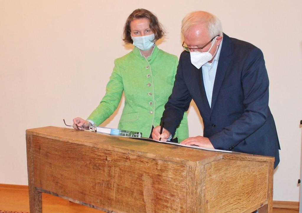 In seiner Glückwunschrede betonte der Landtagsabgeordnete Jochen Ritter, dass der Landtag ohne spezielle Vorgaben grundsätzlich das unterstütze, was jeweils in den Regionen des Landes unter „Heimat“ verstanden wird. Mit seinem anspruchsvollen Konzept führe der Drolshagener Heimatverein seine erfolgreiche Arbeit auf hohem Niveau fort. Der Drolshagener Bürgermeister Uli Berghof bedanke sich beim „Heimatverein für das Drolshagener Land“ für dessen mutige Initiative und die damit in Aussicht stehenden erweiterten Nutzungsmöglichkeiten des Heimathauses für die gesamte Bürgerschaft. Der Ministerin Ina Scharrenbach dankte er für ihr persönliches Erscheinen in Drolshagen und ihre Entscheidung, das Bauvorhaben finanziell aus den bereitstehenden Haushaltsmitteln des Landes zu fördern. Diese Zuwendung sei die höchste Förderung an private Einrichtungen, die je nach Drolshagen geflossen sei. Er freue sich, auch in Zukunft die Ministerin in Drolshagen begrüßen zu dürfen – „gerne auch mit weiteren Bewilligungsbescheiden“ fügte er humorvoll hinzu. Offizieller Schluss der Veranstaltung war die Eintragung der Heimatministerin ins Goldene Buch der Stadt.