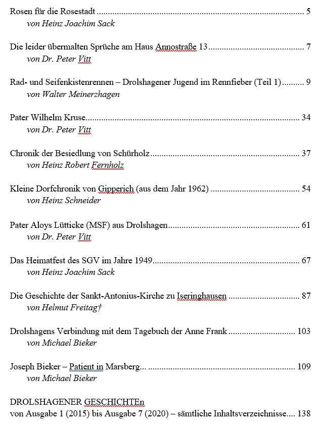 Und wieder haben – trotz der pandemiebedingten Beschränkungen – die Mitglieder der Geschichtswerkstatt im Heimatverein für das Drolshagener Land fleißig geforscht, Archivmaterial gesichtet, Dokumente aufbereitet unddann ihre Ergebnisse in elf Beiträgen für dieses Heft zusammengestellt.